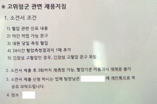 "회사에서 혈압이 정상이라는 것과 야간근무가 10시간 이상 가능하다는 내용을 써오라고 했어요."