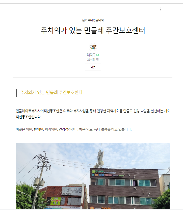 [대덕구 블로그] 주치의가 있는 민들레주간보호센터 상세내용