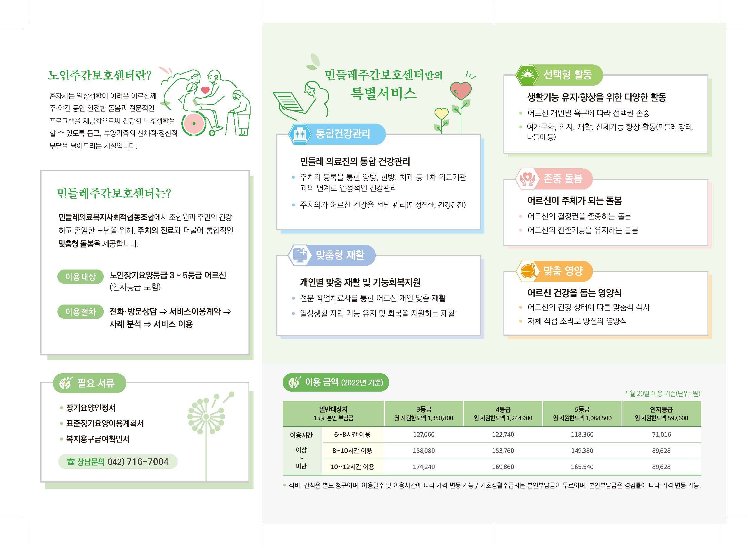 ○주간보호센터 입소 문의 : 042-716-7004 민들레주간보호센터 ○어르신 돌봄 상담 : 042-638-9043 요양주치의팀 ○출자,증자 문의 : 042-638-9053 조합사무실